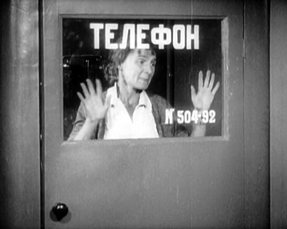 Когда героиня попадает наконец в телефонную будку, звучащая снаружи симфония пишущих машинок сменяется другой полифонией: этакой звуковой изнанкой публичности, состоящей из обрывков голосов, которые звучат по каналам связи. И вплетенный в нее рефрен «Слушайте, слушайте» (явная отсылка к недавней партии репродукторов, голосу публичной власти, обращенному ко всем и каждому), тонет в хаосе случайных разговоров, судя по всему, столь же бессмысленных, как и тот, свидетелем которого только что стала героиня. Телефонного монолога Кузьминой зритель не слышит. На экране дана только отчаянная пантомима и титр, резюмирующий суть высказывания: «Петя! Что же делать? Разве можно не ехать?» При этом телефонная многоголосица продолжает звучать, и зритель понимает, что неслышимая реплика героини является частью общей какофонии. Камера берет сцену то изнутри будки, то снаружи, через стекло. В первом случае звуковое сопровождение остается неизменным, а стекло отделяет героиню от множества беззвучно снующих по коридору людей. Во втором мы видим только Кузьмину, одиноко бьющуюся в стеклянном аквариуме, а бессмысленный хаос телефонных голосов сменяется бодрой симфонией пишущих машинок, на фоне которой продолжается диктовка какого-то официального документа, уже знакомая нам по одному из предыдущих эпизодов: «Нужно не только критиковать недостатки…» Затем наступает полная тишина, и в ней зритель видит совершенно отчаявшуюся героиню, которая мечется в замкнутом пространстве, не в силах вырваться из него в большую жизнь, – причем пространство это лишь создает иллюзию приватности, на деле будучи перенасыщено обрывками чьих-то маленьких чужих историй.