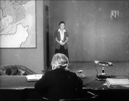 «Звонок другу» не приносит желаемого результата, и Кузьмина возвращается к конторке, но даже и не пытается ничего писать, а попросту впадает в истерику. Появляется второй проводник и без лишних формальностей отводит ее к двери, за которой принимаются решения об учительских судьбах, – и впускает ее внутрь. Там героиня сталкивается с третьим служебным персонажем; это женщина, она подчеркнуто снята со спины – т. е. лишена лица – но, как было сказано выше, очень напоминает Н. К. Крупскую. Судя по всему, здесь мы имеем дело с аллегорической фигурой, призванной воплощать власть как таковую. Войдя в кабинет, Кузьмина оказывается в треугольнике, вершинами которого являются Власть, портрет Ленина и фрагмент карты СССР с изображением Восточной Сибири и Приморья. Сигнал вполне очевиден, но героиня, поддавшись внезапному порыву, в очередной раз делает неверный выбор. Попытка снять с себя индивидуальную ответственность за судьбы родины («Разве я одна?») переходит в очередную презентацию семейного проекта – зажмурив глаза, на фоне все той же «мещанской» темы, на сей раз уже в совершенно шарманочной аранжировке. Колхоз, как известно, есть дело добровольное, а потому Власть не только с готовностью идет навстречу учительнице Кузьминой и желает ей счастливого жизнестроительства, но и – напоказ – выговаривает «отдельным техникумам», которые «вопреки приказу Наркомата направляют учителей на места в порядке разверстки».