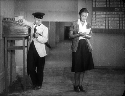 Положительные и отрицательные сигналы также строго чередуются между собой. С первым служебным персонажем героиня встречается в специфическом «коммутаторном» пространстве: по видимости, это просто коридор, заполненный людьми и шумовой симфонией, в которой главную партию ведут пишущие машинки. Но, во-первых, здесь висит огромный щит с полной номенклатурой всех кабинетов и ответственных лиц Наробраза; показательно, что на фоне этого щита зритель видит совершенно потерявшуюся Кузьмину, весь вид которой свидетельствует о том, что она не знает, куда именно ей идти и что ей делать дальше. Во-вторых, здесь есть еще один объект, который представляет собой воплощение местного modus operandi и через посредство которого осуществляется взаимодействие между посетителем и государственной машиной, – конторка с пером, чернильницей и бумагой. Возле этой конторки и стоит служебный персонаж – судя по всему, такая же, как и сама Кузьмина, вчерашняя выпускница педтехникума, но с подчеркнуто детской внешностью4040