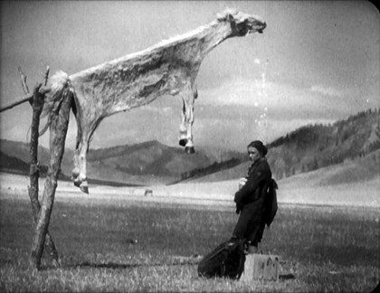 Впрочем, вернемся к нашему фильму, сюжет которого предполагает не одну, а две последовательные инициации. О незавершенности процесса, в результате которого учительница Кузьмина должна превратиться в истинного борца за общее дело, свидетельствует достаточно странная фраза, маркирующая границу между первой, городской, и второй, «экзотической», частями фильма. «Правильные» реплики героини: «Я поеду… Я буду хорошо учить детей» – продолжены еще одной, смысл которой не очевиден: «Разве это не всё?» – вслед за которой зритель переносится в алтайские степи и горы. Реплики даны неозвученными титрами, и самая последняя выбивается из общего ряда еще и чисто визуально, поскольку набрана другим шрифтом. Это позволяет предположить, что здесь звучит уже голос не самой Кузьминой, но какой-то другой, внешний по отношению к ее сюжету. Если это все-таки голос героини, то определенная логика во всем высказывании есть: я сделала свой выбор, чего еще вы от меня хотите? Если же реплика принадлежит некой внешней инстанции, то она предполагает новый виток сюжета – особенно если учесть, что сразу за ней следует радикальная смена всех трех базовых компонентов нарратива: действия, пространства и персонажа (Кузьмина остается той же, но ее социальный статус в новой для нее действительности резко меняется вместе с системой сопряженных с ним социальных ролей).