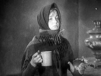 «Пейзаж в сцене гибели учительницы должен был приобрести трагический характер. Мы снимали на покрытом льдом Байкале. В продолжение многих дней мы часами выжидали, когда солнце выходит и прячется за тучами, – Москвин снимал в эти короткие мгновения (обычно при такой погоде съемки отменялись из‐за неустойчивости освещения); накапливались кадры – гигантские тени, как черные крылья, проносились по замерзшему озеру, преследуя девушку» (Козинцев Г. Указ. соч. С. 196). Изменение стилистики в финальных частях фильма могло быть следствием того, что авторы попытались перевести высказывание на принципиально иной уровень. «Воцарение» героини, тот факт, что, превратившись в полноправную «советскую святую», она становится единосущна голосу большой публичности, могло восприниматься как сигнал к необходимости перейти на язык более современный, более динамичный, более «советский», нежели общая стилистика фильма, отчасти построенная на сюжетных мелодраматических ходах. Предшествующее десятилетие успело приучить если не зрителя, то самих кинематографистов к тому, что авангардная, монтажная стилистика – это и есть язык собственно советского кино. Правда, здесь монтаж меняет функциональное наполнение. Если у Льва Кулешова и Сергея Эйзенштейна он представляет собой способ работы со зрительской когницией, имитацию того, как, с точки зрения авторов, работает перенесенное на экран зрительское сознание, то здесь он превращается скорее в эстетический прием, оформляющий жесткое нарративное высказывание, – так же как у Дзиги Вертова времен «Колыбельной» (1937).