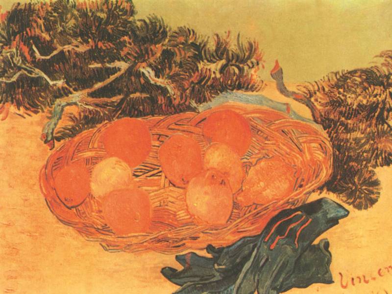 Все предметы на полотне «Натюрморт с сосновой веткой и перчатками» (1889, собрание ван Блаадерен, Амстердам) пронизаны светом горячего южного солнца. На фоне теплого золотистого песка изображена корзинка с оранжевыми апельсинами и желтыми лимонами. Немногословный натюрморт дополняют две пушистые сосновые ветки, хвоя которых написана вихрящимися, динамичными мазками, и темные перчатки – несколько неожиданная деталь для этой композиции. Вероятно, именно эти перчатки мастер использовал, чтобы срезать колючие ветви.