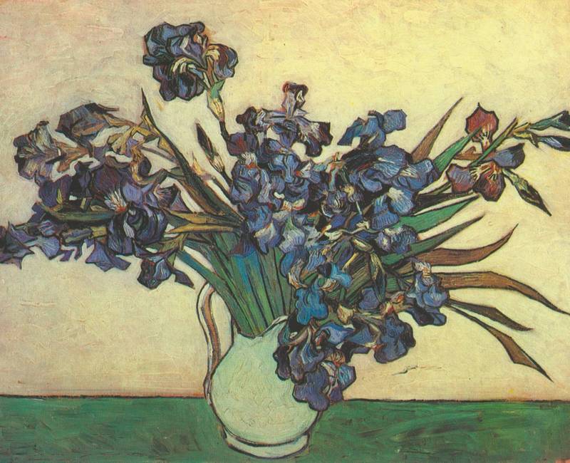 К сожалению, на картине «Ирисы» из Метрополитен-музея в Нью-Йорке фон настолько выцвел, что уже не похож на прежний, розовый. Второе полотно с ирисами находится в Музее Ван Гога в Амстердаме. Хотя цвета этих композиций изменились, их описание, сделанное Ван Гогом, свидетельствует о его интересе к экспрессивным возможностям красочных противопоставлений и оттеночной гармонии, что проявилось и в более ранних натюрмортах, например в серии «Подсолнухи», где ярко-желтые цветы показаны на разнообразных по цвету фонах.