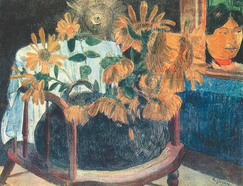 Чтобы передать все очарование этого земного рая, колорит природы Полинезии и ее обитателей, Гоген искал и находил новые приемы. С помощью чистых красок – желтой, красной, лиловой, зеленой – он создавал иллюзию яркого солнечного освещения даже на тех холстах, где не было ни солнца, ни неба («Женщина с цветами в руках», 1899, Эрмитаж, Санкт-Петербург). Тепло дневного светила несут в себе желтые цветы подсолнухов, принесенные в комнату («Подсолнечники», 1901, Эрмитаж, Санкт-Петербург).