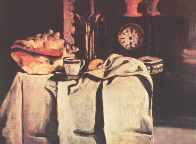 Всем натюрмортам Сезанна свойственна основательность построения, гармония цвета и пластической выразительности, что способствует передаче гармонии всего сущего. Перспектива этих полотен называется перцептивной, то есть глубина пространства на картине значительно приближена к естественному восприятию зрителя. Вероятно, здесь сказались особенности мировоззрения мастера: искусство импрессионистов воплощало идею постоянной изменчивости мира, тогда как для Сезанна гораздо важнее было воплотить противоположное – найти какие-то непреходящие ценности и утвердить некую незыблемость мира. В этом смысле символичным представляется его «Натюрморт с морской раковиной и черными часами» (ок. 1869–1870, частное собрание, Париж). Если приглядеться к изображенным на полотне часам, то можно заметить, что у них отсутствуют стрелки. Быть может, мастер хочет таким образом показать остановившееся время и власть вечности? Показанные на этом полотне предметы были собственностью Эмиля Золя, а часы из черного мрамора являлись памятью о его умершем отце. Часы, огромная раковина, ваза, чашка и лимон стали замечательным мотивом для натюрморта. Эта работа по силе художественного исполнения, а также по благородной простоте и пластичности формы представляется одним из шедевров Сезанна.