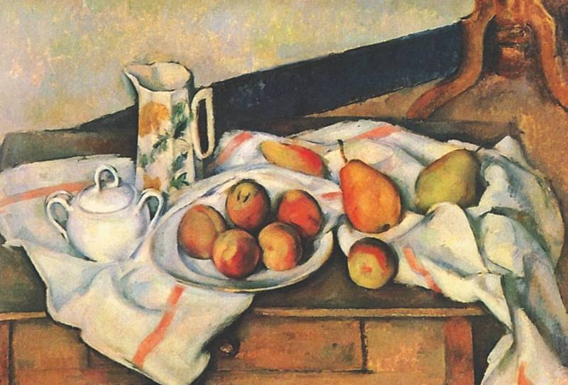 Известно, что художник подолгу, любовно и с огромным терпением расстанавливал предметы, которые должны были составлять композицию натюрморта. Сезанн тщательно размещал разнообразные фрукты, кувшины, ножи, салфетки, кружки, бокалы и бутылки, следя за соразмерностью света и тени, подкладывая одну за другой монеты под персики или яблоки, пока наконец на столе не появлялся необходимый мотив, который мог бы удовлетворить его взгляд и ум. Любимым выражением мастера было: «Композиция цвета… В этом все. Так компоновал Веронезе». «В апельсине, яблоке, шаре… каждом предмете есть самая выпуклая точка, которая ближе всего нашему глазу, и это всегда независимо от самых резких даже эффектов: света, тени и цветовых ощущений. Края предметов бегут к центру, помещенному на нашем горизонте».
