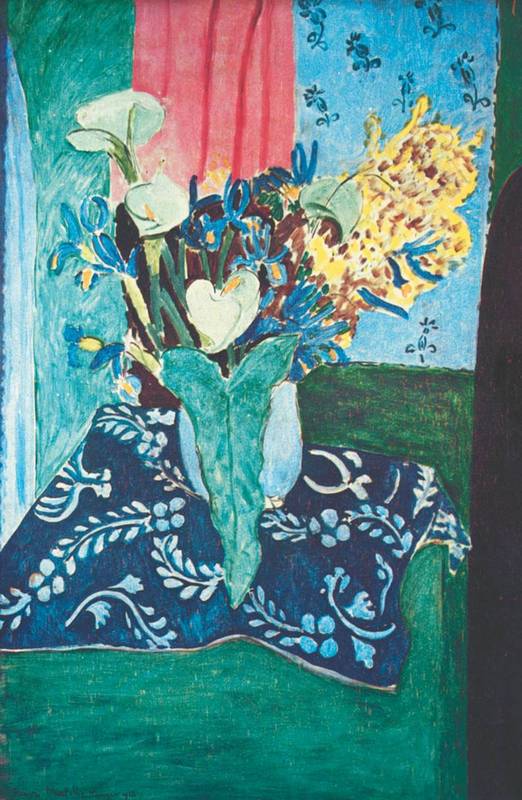 В 1910–1913 годах художник совершил путешествия в Испанию, Марокко и Танжер. Впечатления от увиденного преобразились в чудесные натюрморты, портреты, пейзажи, где элементы экзотики вплетены в общий декоративный строй живописи Матисса («Испанский натюрморт», 1910–1911; «Севильский натюрморт», 1910–1911, оба – в Эрмитаже, Санкт-Петербург; «Госпожа Матисс в манильской шали», 1911, Художественный музей, Базель; «Вид из окна. Танжер», «Зора на террасе», «Вход в казба», 1912, ГМИИ, Москва). В композициях художника появляются вазы с роскошными цветами на фоне разноцветных занавесок и стен, окрашенных яркими красками («Вазы с ирисами», 1912; «Букет цветов на веранде», 1913, обе – в Эрмитаже, Санкт-Петербург; «Голубая ваза с цветами на синей скатерти», 1913, ГМИИ, Москва).