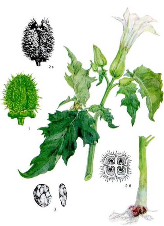 Дурман обыкновенный (Datura stramonium L., сём. Паслёновые – Solanaceae). Встречается главным образом в южной части Нечернозёмной зоны небольшими группами по мусорным местам (рис. 4). Как лекарственное растение разводится на Украине и в Краснодарском крае.