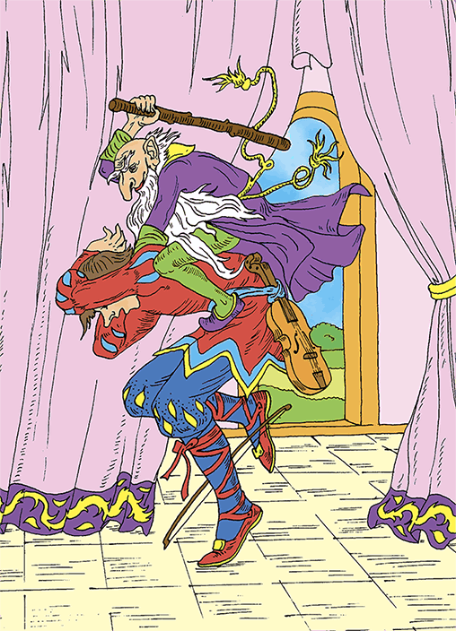 Собираясь в этот таинственный замок, музыкант на всякий случай захватил свою скрипку, он достал ее и заиграл веселую мелодию. А наигравшись вволю, сел за накрытый стол и принялся за обе щеки уплетать расставленное на нем угощение. Вдруг дверь распахнулась, и в комнату вошел старичок. Был он не больше метра ростом, одет в яркий халат. Глубокие морщины покрывали его крохотное лицо, а серебряная борода спускалась до самых носков его туфель. Старичок сел рядом со скрипачом и тоже принялся за еду. Когда они дошли до дичи, скрипач протянул карлику нож и вилку и предложил первому выбрать себе кусок. Старичок кивнул, но оказался так неловок, что отрезанный им кусок мяса выскользнул и упал на пол.