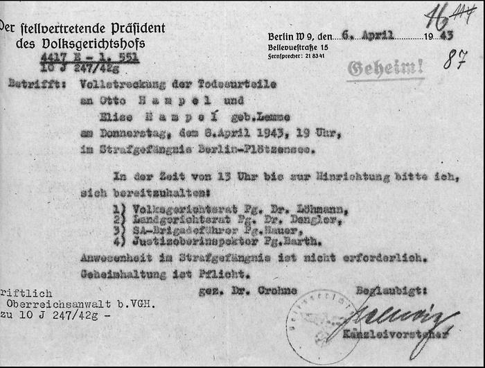 Секретный документ, определяющий время и место казни супругов Хампель – 19:00 6 апреля 1943 года, тюрьма Плетцензее в Берлине, и указывающий поименно официальных лиц, обязанных присутствовать на ней