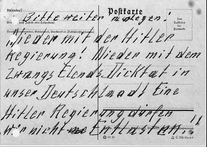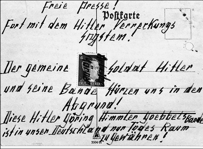 Написанные супругами Хампель открытки призывали не оправдывать нацистский режим, свергнуть гитлеровское правительство, уничтожить систему и ее главарей – Гитлера, Геринга, Гиммлера, Геббельса