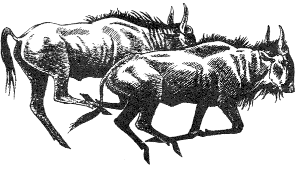 Черные носороги попались нам на глаза дважды. Сначала мы заметили крупную самку с годовалым детенышем. Мамаша почти мгновенно среагировала на звуки наших голосов, которые донес до нее легкий ветерок. Находясь от нас на расстоянии около семисот метров, она начала угрожающе топтаться, а затем повернулась в нашу сторону, уставившись на непрошеных гостей своими близорукими глазами. Уяснив для себя, что мы находимся достаточно далеко, носорожиха развернулась на сто восемьдесят градусов и засеменила к далеким холмам в сопровождении детеныша. Вскоре звери скрылись в густых зарослях кустарника. Вторая встреча с носорогом выглядела совершенно иначе: молодой самец мирно пасся недалеко от дороги и не обратил на нас ни малейшего внимания.