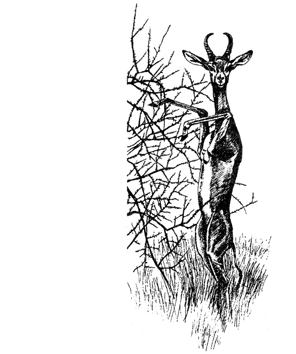 Продвигаясь вперед, мы вскоре осознали, что пересекли уже никак не обозначенную границу заповедника и едем по территории Кора. Первым обитателем этих мест, попавшимся нам на глаза, был проскакавший мимо серенький дик-дик, а чуть позже мы увидели окрашенную в бронзовые тона жирафовую газель, промчавшуюся через дорогу. Эти животные кормятся в основном древесными побегами и листьями, но по внешнему виду имеют друг с другом очень мало общего. Антилопа дик-дик имеет высоту в холке всего около тридцати пяти сантиметров, весит от трех до пяти килограммов и питается побегами невысоких кустиков и их молодой порослью. Жирафовая антилопа, или геренук, – животное средних размеров, кормом которого служат ветви более высоких кустов и молодых деревьев. Особенностью геренука является очень длинная шея, которая вкупе с привычкой этой антилопы становиться при кормлении на задние ноги позволяет ей дотягиваться до побегов и листьев, недоступных другим видам антилоп таких же, как она, размеров. Когда наша машина переезжала через песчаное русло протоки (по местному – люгга), мы впервые увидели еще одну антилопу – малого куду. Она немного мельче, чем обитатель Южной Африки большой куду, но выглядит, пожалуй, даже более привлекательной. Подобно дик-дику и геренуку, эта антилопа промелькнула мимо нас и скрылась в переплетении сухого кустарника и густой травы.