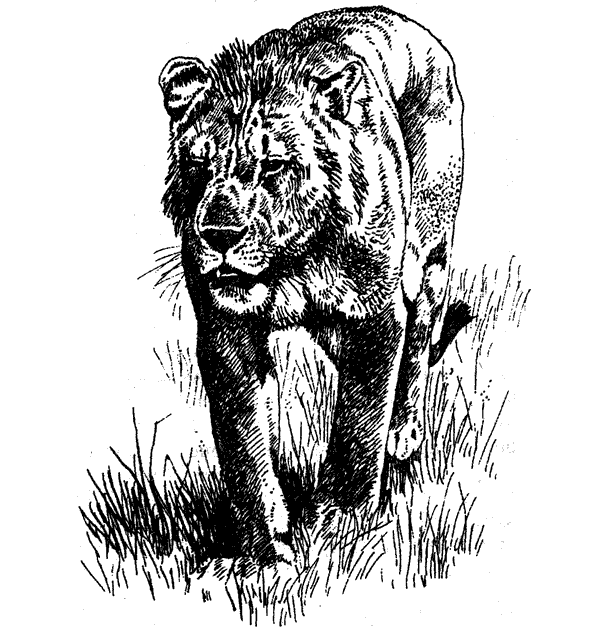 Возвращаясь к рычанию Батиана, я должен, в первую очередь, объяснить, как в действительности рычит лев. Лев набирает полные легкие воздуха, напрягает мышцы живота, сжимая воздух, и выдыхает, заставляя колебаться голосовые связки, издающие могучий звук, слышный за многие километры. Рычание начинается громким стоном, а затем усиливается и превращается в череду ревущих звуков, за которыми следует почти столь же громкое ворчание.