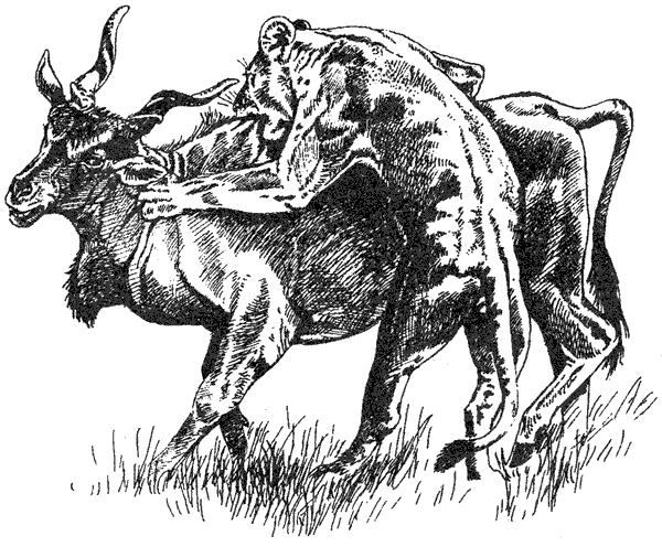 Так, за пятидневный период наблюдения за львами с помощью радио мне удалось установить, что они добыли одну взрослую самку куду, одну самку антилопы канна, одного бородавочника, одного взрослого самца антилопы канна и одного крупного быка из Зимбабве, который имел неосторожность несколько недель назад притащиться сюда для пастьбы в долине, в восточной части территории, контролируемой моими львами.
