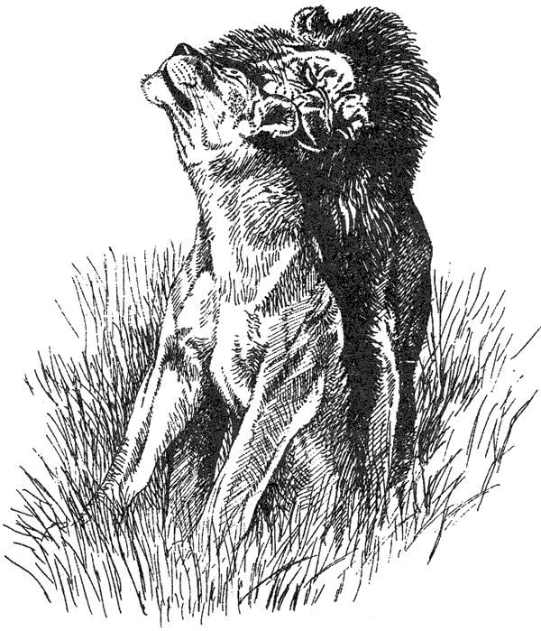 Одного детеныша схватила Фьюрейя и тут же умертвила, а другого сшиб на землю Батиан и стал с ним играть. Наполовину выпустив когти, он дергал и цеплял его. Меня потрясли вопли и крики детеныша, равно как и протестующий против такого издевательства лай остальных членов семейства.