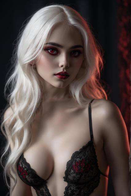 Она делает паузу, её алые глаза сверкают. Она кокетливо прикусывает кончик своего пальца, глядя прямо на вас.