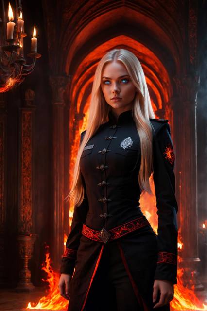 Чёрная одежда, напоминающая военную форму – строгий китель, высокие сапоги, серебряные пуговицы, тускло поблёскивающие в свете магического пламени. Распущенные светлые волосы. Знакомые черты лица.