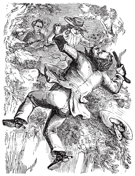 Том, соскользнув с края площадки, покатился вниз по поросшему кустами и деревьями крутому склону, пока, разбитый и стонущий, он не очутился на дне обрыва. Падение было бы смертельным, если бы оно не было несколько смягчено ветвями деревьев, за которые цеплялось его платье. Все же Том ударился о землю много крепче, чем ему было желательно.