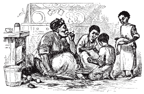 Вокруг нее живописно группировались негритята, которых всегда такое множество в большом хозяйстве на Юге. Одни лущили горох и чистили картофель, другие ощипывали тонкий пух домашней птицы.