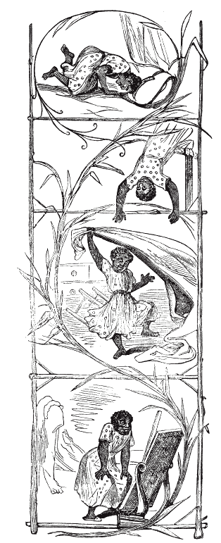 Случалось, что мисс Офелия прибегала и к этому средству. С Топси при этом обязательно делались судороги, она пронзительно кричала, рыдала и стонала. Полчаса спустя, вскарабкавшись на какой-нибудь выступ балкона, она, окруженная толпой негритят, выражала свое полное презрение ко всему случившемуся.