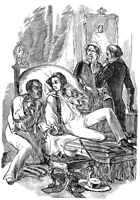 Мисс Офелия превратила одну из кушеток в постель. На ней уложили раненого, обливавшегося кровью. Сен-Клер лишился чувств от боли и слабости. Кроме того, он потерял много крови. Мисс Офелия поднесла к его носу ароматическую соль. Сен-Клер пришел в себя, раскрыл глаза, обвел взглядом комнату и остановил его на портрете матери.