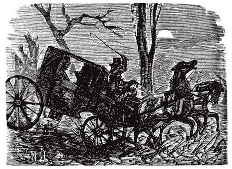 Сенатора, женщину и ребенка швыряет из стороны в сторону, они ежеминутно меняют положение. Куджо на козлах осыпает коней бранью. Колеса увязают, вздрагивают. Затем карета катится дальше. Передние колеса снова проваливаются в грязь. Сенатор, женщина и ребенок падают на переднее сиденье. Шляпа джентльмена без всякого стеснения съезжает на самые глаза ее владельца. Сенатору кажется, что это – конец. Ребенок плачет. Куджо читает своим лошадям очередную проповедь, они брыкаются, поднимаются на дыбы и рвутся вперед под ударами кнута. Выбираясь из ямы, экипаж снова обретает равновесие.