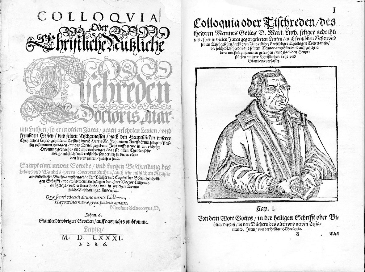 Немецкий бестселлер: «Застольные беседы» Мартина Лютера, издание 1581 г. Лютер много сделал для унификации немецкого языка. Вплоть до 1940-х все немецкие тексты печатались готическим шрифтом.