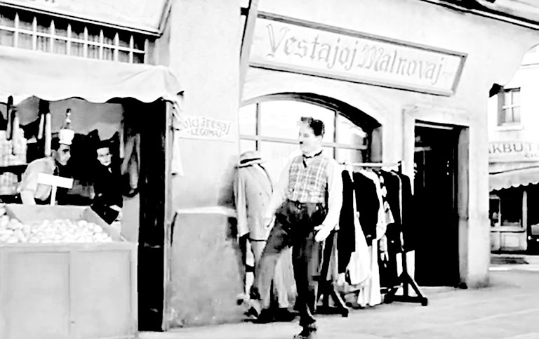 Вывески, написанные на эсперанто (хотя и не совсем правильно), из фильма Чаплина «Великий диктатор»