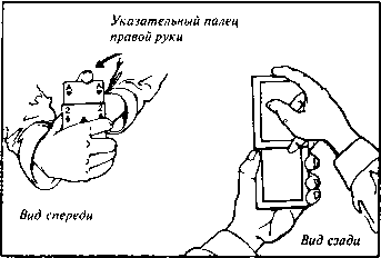 Перетасуйте карты, беря их большим пальцем правой руки сзади, а остальными пальцами – спереди (со стороны зрителя) и держа мизинец левой руки в промежутке.