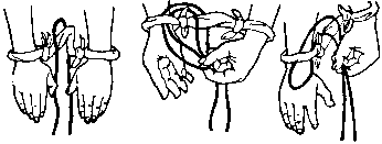 Заложите руки за спину. Как только вы это сделаете, поднимите петлю на веревке пальцами левой руки. Держите ее крепко между вашими запястьями, поместив запястье правой руки под узлом на левом запястье. Все это делается очень быстро. Теперь повернитесь спиной к зрителям и перенесите концы веревки над вашим правым запястьем и крепко свяжите.