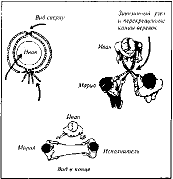 Попросите Марию передать одну из двух веревок, находящихся у нее в руках, и сами передайте ей одну из ваших веревок. Не имеет значения, какими из веревок вы обменяетесь. Держите свои «старые» веревки в одной руке, а в другую возьмите «новые» веревки, предварительно перекрестив их, но не завязывайте. Отдавая одну из веревок Марии, сами возьмите одну из ее веревок. Попросите ее держать концы крепко и, когда вы дадите ей сигнал, сильно потянуть обе веревки на себя. Иван должен по этому же сигналу сделать два шага назад.