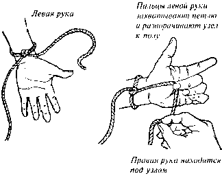 Вам понадобится кусок веревки или каната длиной 1 м. Отрежьте кусочек длиной 8—10 см от одного конца. Сделайте из него петлю и спрячьте ее в левую руку, расположив саму петлю вдоль пальцев (см. прием «Прятки в ладони»).