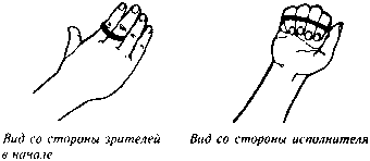 После того как вас связали, встаньте лицом к зрителям между двумя помощниками. Пусть они стоят близко к вам. Освободите вашу правую руку из петли, протяните ее и дотроньтесь правой, рукой до правого плеча зрителя. Он обернется, и, конечно, зрители увидят вашу руку и засмеются. Затем переместите свою руку в петлю, развернитесь и покажите, что вы все еще крепко связаны. Повторите это один или два раза и затем подойдите к правому боку другого зрителя и повторите то же самое с ним. Всегда показывайте, что ваши руки связаны, после того как постучите по плечу одного из зрителей.