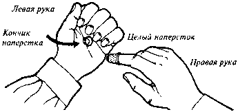 Положите наперсток вместе с дополнительным кончиком на нем в левый кулак. Туда же засуньте указательный палец правой руки и наденьте наперсток на него, оставив дополнительный кончик в левой руке.