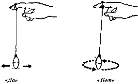 Передайте зрителю веревку с грузом, и пусть он проденет в кольцо (или петлю) свой указательный палец и держит перед собой. Попросите его держать палец прямым и вытянутым, как будто он указывает на что-нибудь. Вы зададите ему несколько вопросов, которые предполагают ответы типа «да» – «нет». Он не должен отвечать на них, но висячий груз будет колебаться вперед-назад, если ответ «да», и по окружности, если ответ «нет».