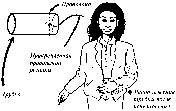 Еще раз используйте квадратный платок со стороной 30 см. Вы можете использовать платок из предыдущего фокуса. Вам также будет необходима «тяга». Вы легко можете выполнить ее из трубки диаметром примерно 2,5 см. Отрежьте кусок трубы длиной 5 см и покрасьте его в черный цвет. С помощью кусочка проволоки, шпильки для волос или кусочка веревки прикрепите к одной из сторон «тяги» конец резинки длиной примерно 30 см.