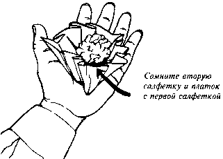 Попросите зрителя помочь вам. Как только он подойдет, вытащите платок из кармана пиджака и незаметно спрячьте его в ладони левой руки (см. прием «Прятки в ладони»). Положите на стол несколько бумажных салфеток. Попросите зрителя дать вам одну салфетку. Возьмите ее правей рукой и положите на левую руку, которая держит спрятанный в ладони платок. Сомните кусок бумаги вокруг платка и сделайте маленький шарик.