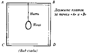Вам необходимо обманное деревянное яйцо или резиновый мячик для этого фокуса. Прикрепите канцелярскую кнопку к концу яйца. Вам также потребуется мужской носовой платок. Вокруг кнопки привяжите конец короткой черной нити к яйцу или мячику. Другой конец нити прикрепите к середине одного из краев платка так, чтобы при подъеме платка за два угла этого края яйцо повисало бы на нити в центре платка. Положите платок на стол так, чтобы вы смогли поднять его за углы и заставить яйцо незаметно повиснуть.