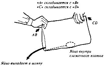 Возьмите мужскую шляпу и положите ее на стол. Поднимите платок так, чтобы яйцо, висящее за ним, не было видно зрителям. Соедините два верхних угла вместе и держите их между большим и указательным пальцами правой руки. Зажмите два угла, свисающие вниз, левой рукой. Теперь выровняйте правую и левую руки в горизонтальном положении. Наклоните один конец платка для того, чтобы яйцо покатилось вдоль платка, внутри него, и упало в шляпу.