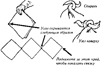 Вам необходимо научиться связывать красные платки «исчезающим узлом» так, чтобы они выглядели туго связанными, но легко развязались, когда вы захотите. Чтобы добиться этого, начинайте так, как будто вы собираетесь связать платки двумя простыми узлами. Первая часть узла, которая делается быстро, – спираль. Вторая часть, которая как будто делает узел завершенным, – простой одинарный узел. После этих «завязывающих» движений будет казаться, что узел по настоящему завязан.