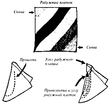 Сложите синий платок пополам по диагонали и пришейте «карман» по кривой линии почти по всей длине платка сверху донизу. Привяжите один из радужных платков к углу синего платка и уберите его внутрь синего, в центр первого. Другой конец радужного платка оставьте снаружи кармана так, чтобы он выглядывал из кармана синего платка и казался углом синего платка. Разместите «тягу» там, где вы ее легко сможете достать.