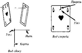Возьмите одну из дополнительных карт (дубликаты тех карт, которые находятся в колоде), сделайте надрез длиной 1,25 см по центру короткой стороны карты сверху. Проденьте плотную черную хлопчатобумажную нить через разрез. Завяжите узел на нити с лицевой стороны карты и плотно подтяните его к карте. Положите эту карту рядом с колодой так, чтобы нить была не видна зрителям. Возьмите вторую дополнительную карту, дубликат карты, который вы собираетесь навязать зрителю, и положите ее на карту с нитью так, чтобы нить ушла под навязанную карту.