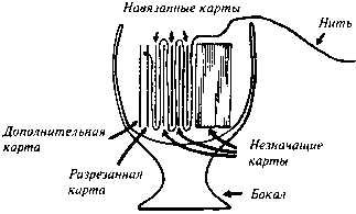 Для выполнения этого фокуса вам потребуются стеклянный бокал, достаточно большой для того, чтобы в него уместилась колода (бокал подготавливать не надо), колода карт и черная хлопчатобумажная нить. Кроме того, необходимы десять или больше дополнительных карт. Положите колоду в бокал.