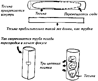 Вам также потребуется клейкая лента, чтобы закрепить бумажную трубу. В один конец «окрашивающей» трубы поместите три цветных платка, протолкните их в трубу максимально далеко. Платки дойдут до конца петли из тесьмы, оставив свободным конец трубы. Они не упадут, так как тканевая тесьма остановит их. Теперь поставьте перегородку на стол, повернете ее к зрителям, а за ней поставьте «окрашивающую» трубу. Конец, в котором видна тесьма, держащая платки в трубе, должен быть ближним к столу. Набросьте три белых платка на верхушку перегородки так, чтобы они свисали большей частью со стороны зрителей. Положите подготовленный кусок бумаги рядом с перегородкой, а вдоль перегородки положите тесьму.