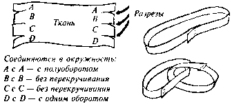[Закрыть] После склеивания С полосой Д сделайте полный поворот перед склеиванием ее. Две центральные части склейте без поворотов. Ткань, когда рвется в центре, образует две окружности. Наполовину перекрученная полоска образует одно большое кольцо, в то время как другая полоска с полным поворотом образует два связанных между собой кольца