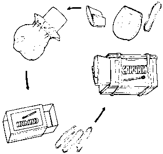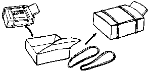 Поместите трубу в отверстие мешочка и плотно стяните маленькой резинкой верх мешка и трубы. Поместите мешок и трубу в спичечный коробок, но пусть труба торчит. Закройте коробок как можно плотнее. Стяните его резинкой с обеих сторон. Положите спичечный коробок в коробку и стяните ее резинкой или двумя, проходя вокруг коробки с обеих сторон. Конечно, труба будет торчать, но, когда вы потяните ее, то мешок закроется и коробки также будут плотно закрыты. Поместите этот подготовленный реквизит в один из ваших карманов.
