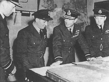 Король Георг VI посещает 617-ю эскадрилью. Гибсон показывает на макете, как была уничтожена дамба.