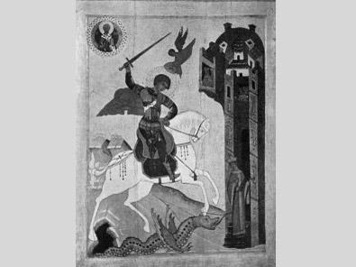Но оказывается, что "змееборец" и "змей" – одно. Изображение всадника-змееборца становится гербом Московского Царства ("ездец" или "царь на коне"), типологически совпадает с общеправославными изображениями святых воинов – Георгия Победоносца, Димитрия Солунского и др. Равно как и самого Михаила Архангела, которому Царь Иоанн Васильевич Грозный написал канон Ангелу Грозному Воеводе – победителю Князя Тьмы, "змия древнего". Но Георгию Победоносцу тезоименит – прямо или косвенно, в качестве "народной этимологии" – и первый Русский монарх – Рюрик ("Юрик") – кстати, на недавно найденном камне на его (предположительно) могиле-кургане ("Шум-гора") есть трудноразличимая надпись – то ли "Григорий", то ли "Георгий". Отсылка к "конной" символической родословной есть и в именах династии Романовых, новгородские предки которых носили родовые имена Кобыла, Жеребец, Шевляга Что же до самого змея, то здесь все еще сложнее. Современный русский историк И.Я.Фроянов высказывает (вслед за В.Я.Проппом) такие соображения: "Между князем и змеем, возможно, устанавливается какая-то связь, которая заслонена в былинных сюжетах более поздними впечатлениями и дальнейшим развитием эпических мотивов. Наиболее осязательна эта связь в былине о походе Вольги. Это связь прямого родства. Здесь она не подновлена и не затемнена последующими наслоениями. С точки зрения происхождения мотива, согласно наблюдениям В.Я.Проппа, "рожденный от змея (т.е. прошедший сквозь него) есть герой. Дальнейший этап: герой убивает змея. Их историческое соединение дает: рожденный от змея убивает змея". (См. Фроянов И.Я., Юдин Ю.И. "Былинная история", СПб, 1997, с.98, см. тж. Пропп В.Я. "Исторические корни волшебной сказки", Л., 1946, 254-256). Но, убивая змея, отождествляя себя с земледельцем, Рюрикович, монарх тем самым символически убивает своего первопредка, династического князя "змеиной", "фиолетовой" крови!