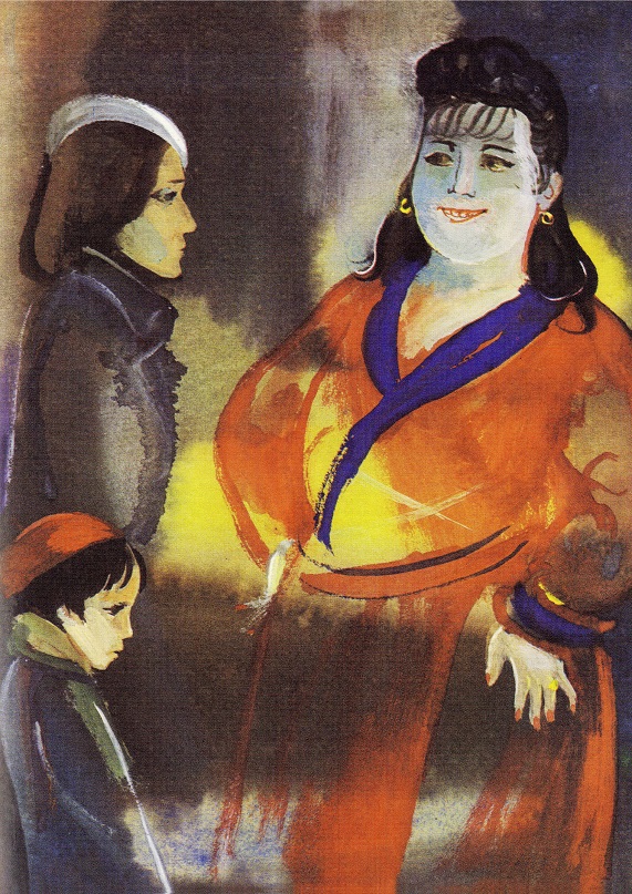 Перед знакомой дверью мама позвонила и взяла девочку за руку. Им открыла женщина в белой косынке, которая была повязана вокруг головы и завязана на затылке, – так в Мышкине повязывали свои головы женщины, работая на огороде, и юбка её была подоткнута так же, и босые ноги были в галошах. Вся она была очень высокая и очень широкая, прямо великанша какая-то.